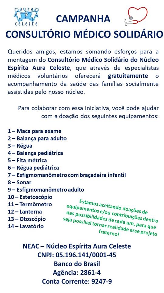 Contamos com a sua colaboração para que possamos criar um Laboratório Médico Solidário, para atendimento dos nossos assistidos. Agradecemos seja qual for o tipo de ajuda. Contato: neac@neacrio.com.br
