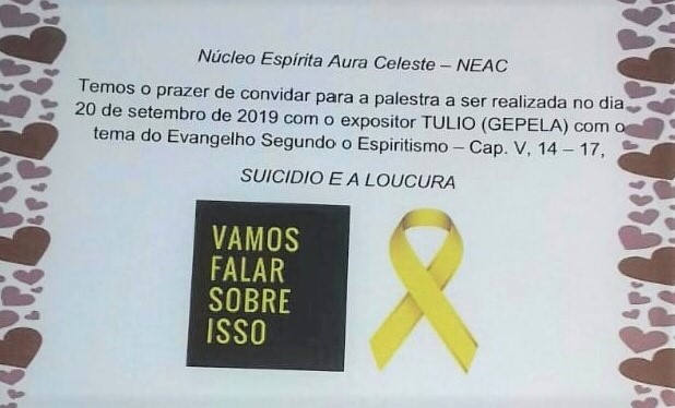 Setembro Amarelo é a campanha nacional de prevenção ao suicídio. Convidamos a todos para participarem da nossa palestra pública sobre suicídio na perspectiva espírita. Vamos falar sobre isso? Aguardamos vocês!